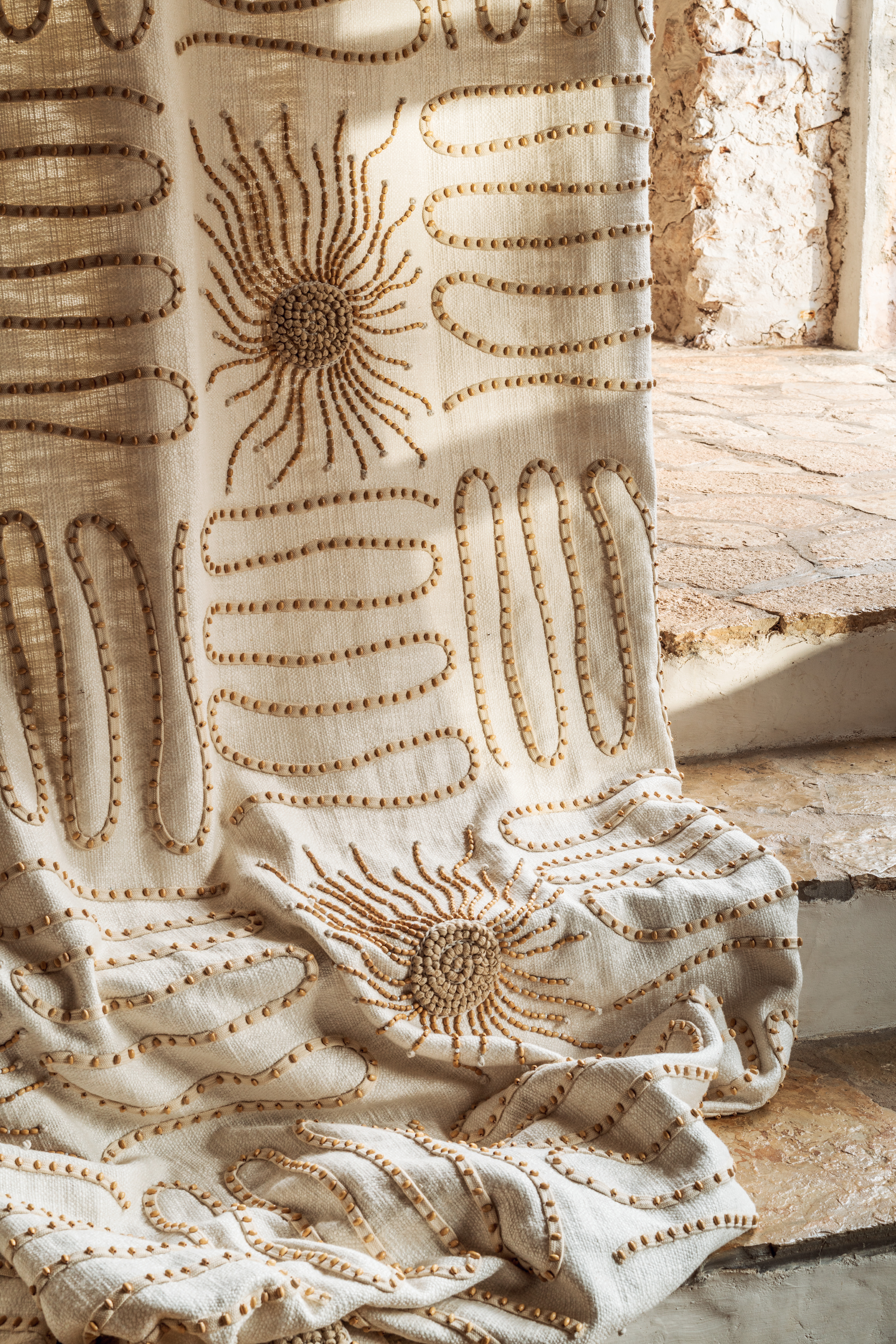 plant textiles, bamboo woven with metallic thread, shagreen patterning under glass beads...