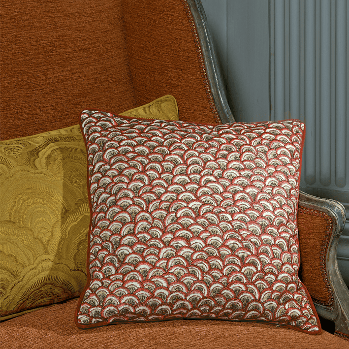 Reinterpretation of a detail of a Kalemkar from the archives of the Maison, this pattern of large scales is here reinterpreted in a very beautiful damask quality woven on silk warp and weft cotton and linen. Its construction inspired by brocatelles gives it a subtle relief, an elegant hand and a fine sheen.