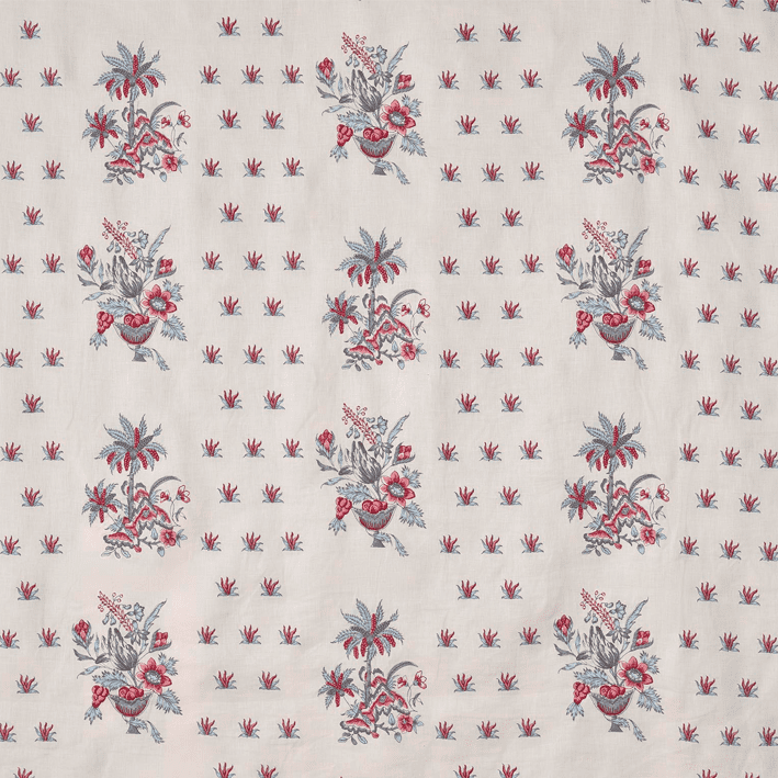 This embroidery is a reinterpretation of a canvas printed in France with the block printing technique in the last quarter of the 18th century. Inspired by floral indiennes, the original document is preserved in the company's archives. This delicate design of palm trees and flowers is finely embroidered on a magnificent linen twill. Also available in a semi-coordinated version, COULONGES CONTREFOND B7660, as well as a wall covering.