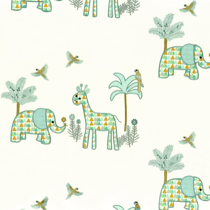 “Paul & Marius” the giraffe and the elephant are embroidered with a beautiful appliqué printed with small blue and green triangles, acidic and fresh. They live in a fairytale world filled with flowers, plants and tropical birds to tell magical stories about nature.