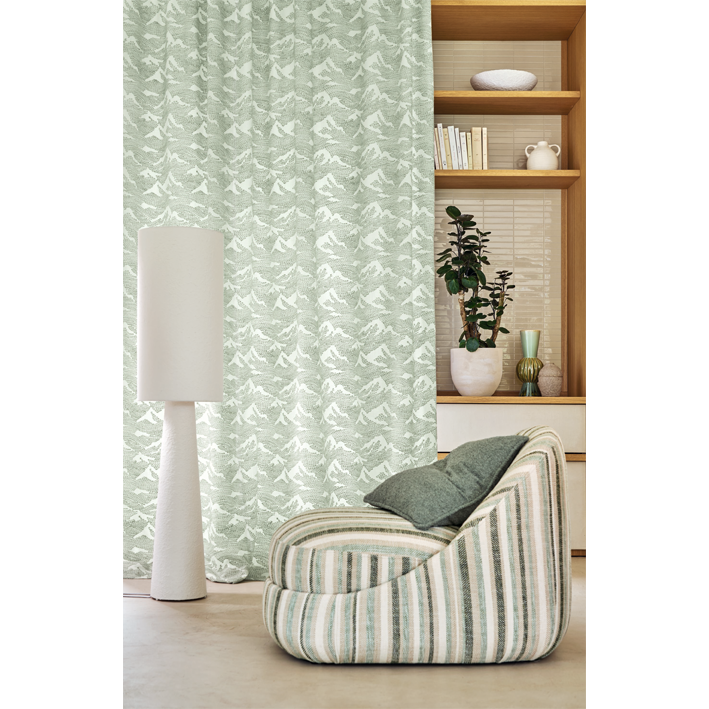 “PIEMONTE” suggests a mountain landscape on a linen-look fabric. The panorama is subtly expressed using delicately embroidered stitches. The cotton and linen embroidery thread has a two-tone look that accentuates the natural style of the fabric and the softness of the décor.