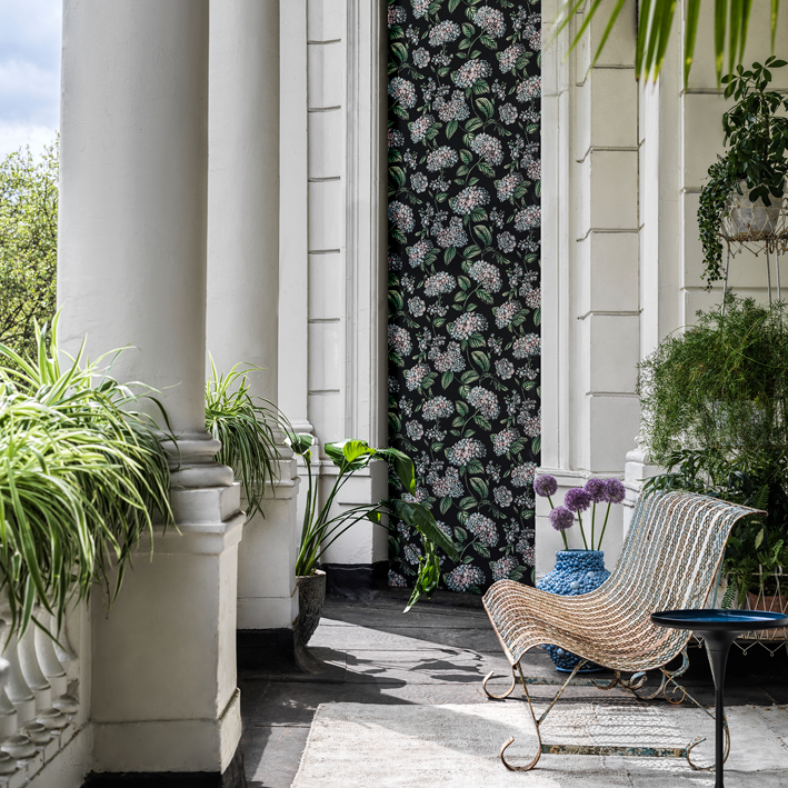 Ortensie 디자인은 밀라노 Fornasetti 하우스를 둘러싼 가든에서 자라는 풍성한 덤불을 이루는 수국을 바탕으로 만들어졌습니다. Pierro Fornasetti가 1950년대에 만든 이 디자인은 여러 테이블과 트레이에 사용되었습니다.