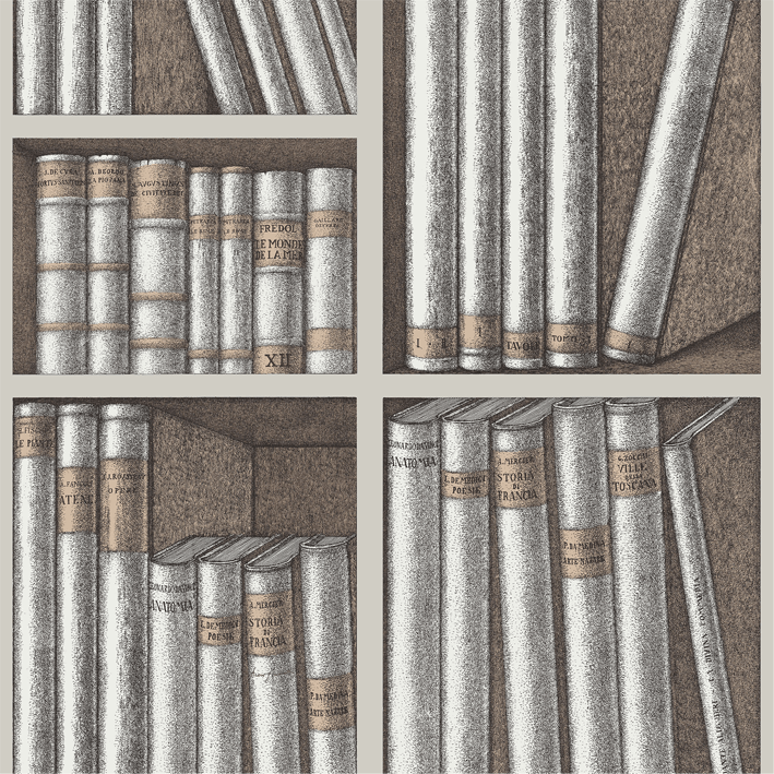 응용 예술에 관한 책을 모으는 열성적인 컬렉터였던 Fornasetti는 아틀리에의 아카이브 전체를 걸쳐서 볼 수 있듯이, 책을 반복되는 테마로 삼아 디자인에 담았습니다. 가죽으로 감싼 책들이 빼곡히 들어찬 Ex Libris의 라이브러리를 닮은 트롱프뢰유 장면은 1953년 스크린을 재해석한 디자인입니다.