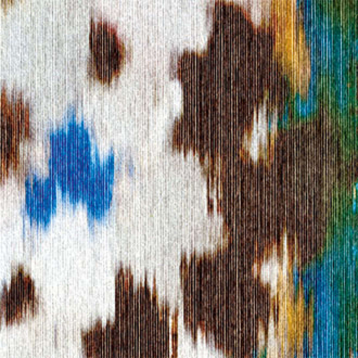 End-on-end bonded and tightened on non-woven backing, the tone is set for a collection inspired by fabric printing, designs inspired by Moroccan dyes, Indonesian batik sarongs. In a pictorial motif theme incorporating fused inks and watercolour drawings.