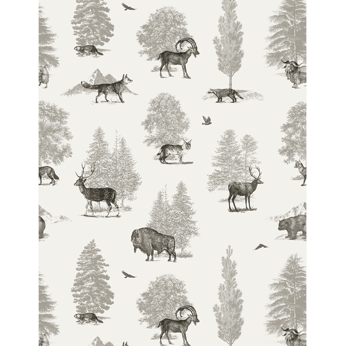 Head to the wilderness with this animal and tree toile de jouy wallpaper. Wild animals and birds like racoons, wolves, lynx and eagles roam amongst pine trees and mountains, imagined in this wallpaper in trendy vintage etched style. In trendy vintage colours, this is a animal toile de jouy wallpaper to bring the outdoors into your home.