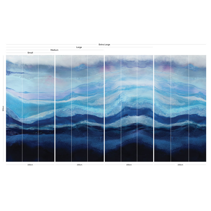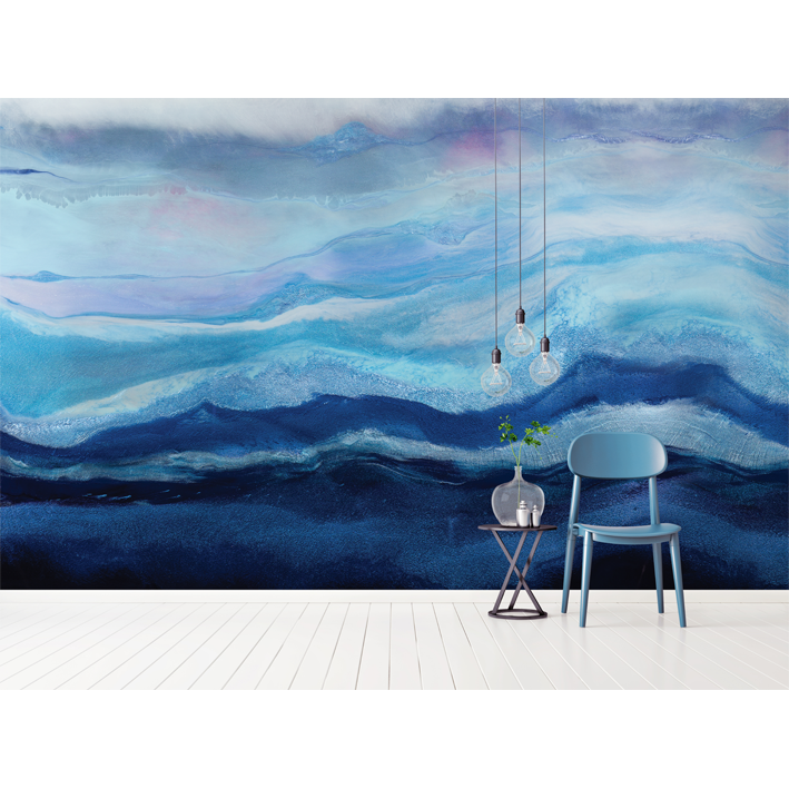This richly pigmented seascape wallpaper mural is layered with hues of indigo and aquamarine pigments. Depth and movement were created to draw the viewer into the waves. A layer of arctic mist hovers above the water creating a sense of chill in the air. A cool toned color palette was used to create this modern resin painting.