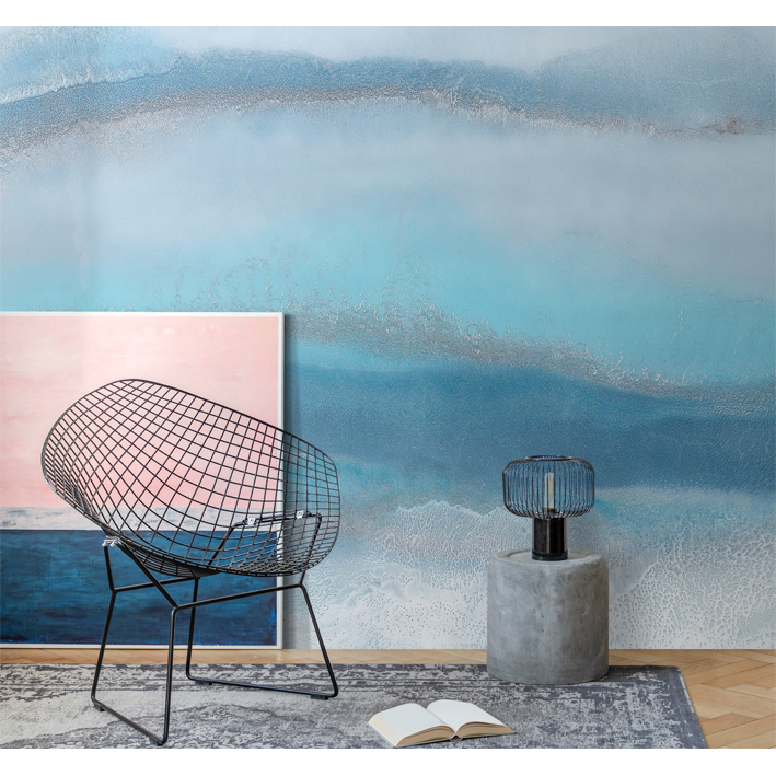 This modern, glossy, seascape wallpaper mural, originally painted as a resin artwork layered with soft blue hues and silver metallic pigments. Shimmering iridescent mica powder was added to the original artwork to create a hint of sparkle in the foamy white waves. A cool toned color palette was used to create this serene, multi-dimensional seascape.