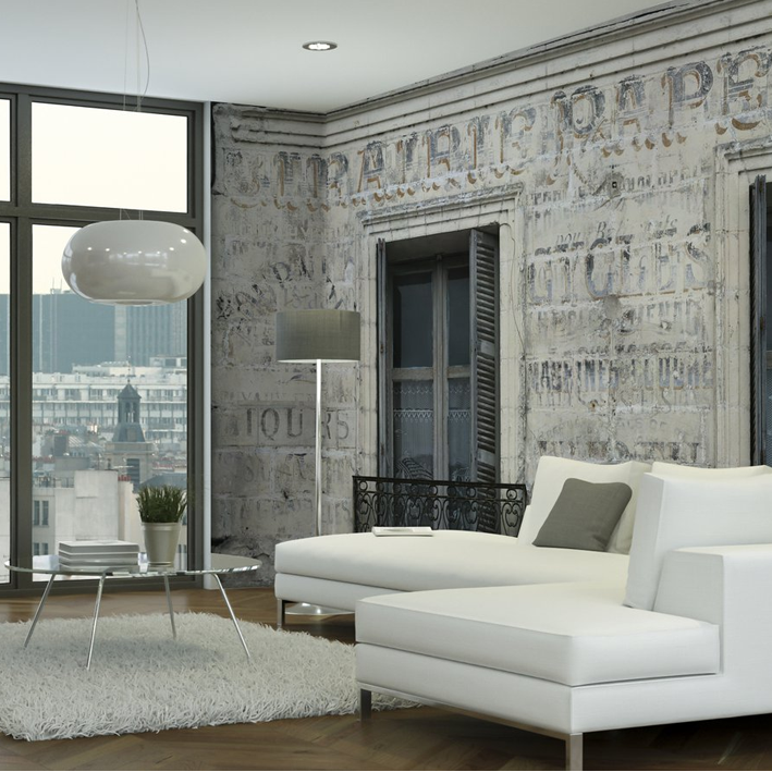 A few traces from another time of these magnificent typographies painted by hand, with patience and genius. Bluish traces on grey wall and putty. What a softness for this unforgettable panoramic wallpaper!