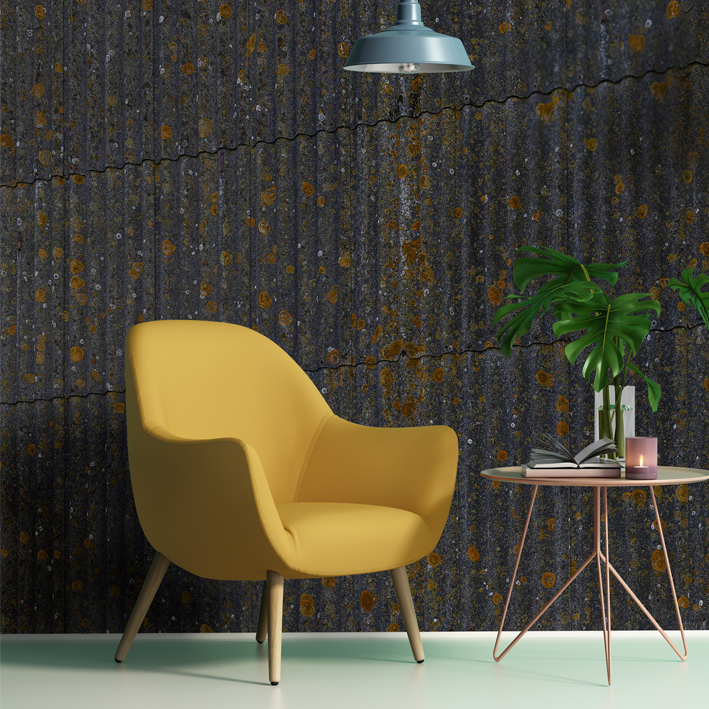 Corrugated metal exposed to all types of weather. Thousands of small touches of yellow and grey ochre lichen, on this anthracite flat, give lightness and a pictorial side to this simple sheet metal. The result is an ultra aesthetic panoramic wallpaper.
