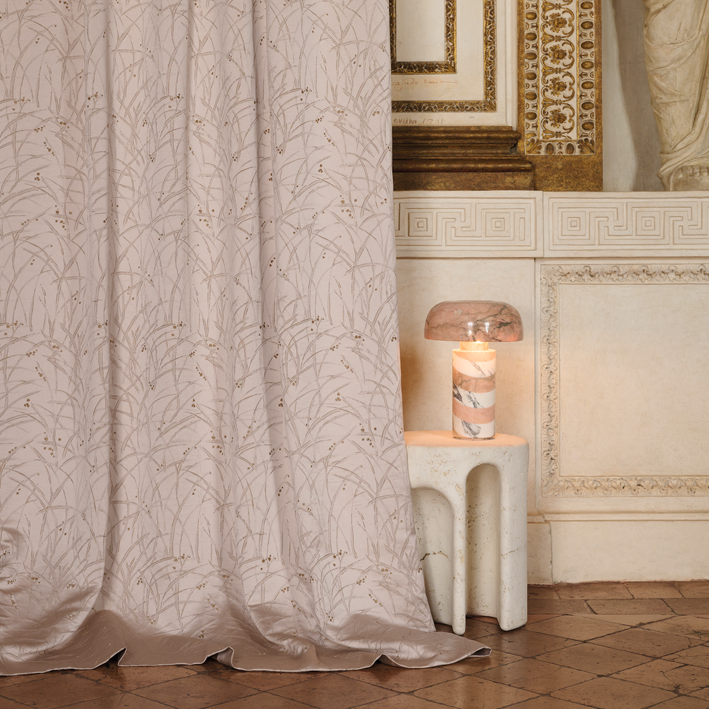 A celebration of springtime in satin with “Fulgurance”. Made in Italy, this poetic blossoming – of dreams, ideas or plants – is made possible by the weave on a base of linen, cotton and viscose, tracing these budding, linear patterns. The color range of “Fulgurance” is divided into four soft pastels shades: Powder Pink, Pearl, Ivory and Greige.
