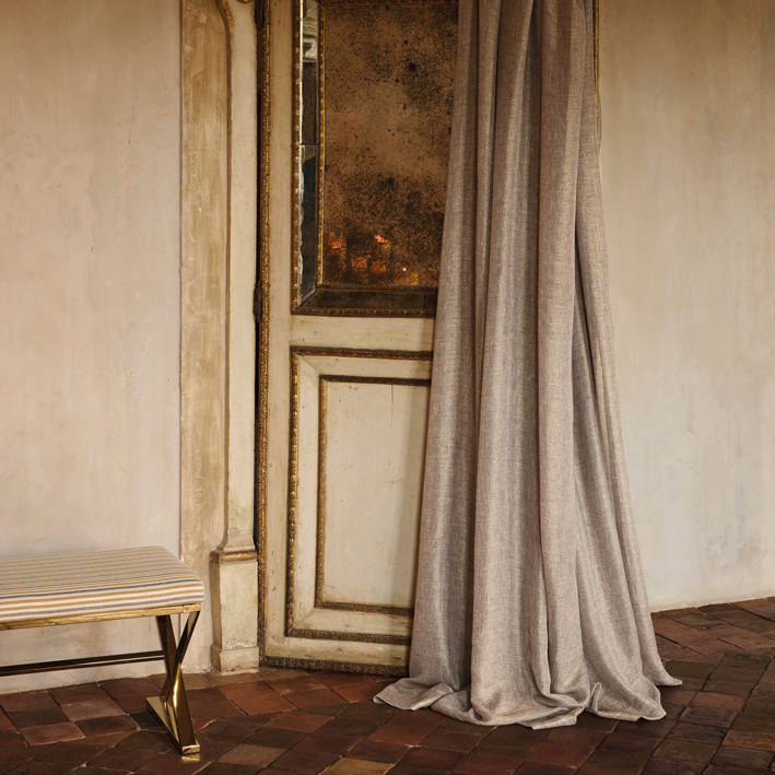 Made in Italy, “Esquilino” is a voile with a transparent and airy mesh through which light and air easily pass. Its linen fibers give a natural and refined appearance, whilst the decorative metallic yarn in the weft provides the sophisticated iridescence that makes it so original and modern. An “Airo” finish loosens and softens the fibers for a soft touch and flowing drape. This voile comes in four very tonal colors: Alabaster, Ivory, Silver and Sepia. Along with “Bagliore” and “Colisée” it is one of the three double-width designs in the collection.