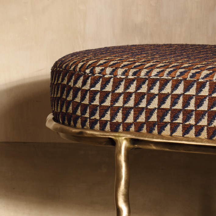 Produced in four very modern colors, Celadon, Olive Green, Bronze and Copper, the small “Berlioz” design takes this jacquard by storm. Its gold, satin-coated yarn is combined with its colored base, to compose a web on this geometric checkerboard, creating sophisticated matte and lustrous effects. A third color adds depth to the pattern. As for all our creations, this jacquard, woven in Italy, was firstly developed by our design studio.
