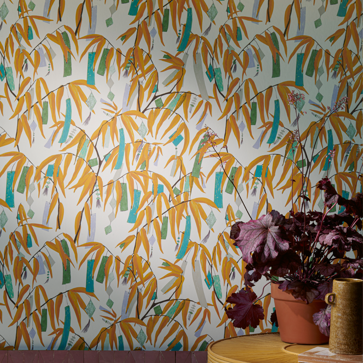 다채로운 색감을 자랑하는 리본으로 뒤덮인 대나무를 담은 일러스트레이션에서 일본 타나바타 축제 여름날의 즐거움이 느껴집니다. 넓은 폭의 매트한 non-woven 배킹에 프린트되었습니다.