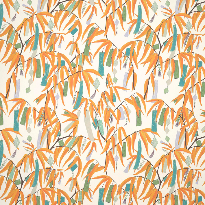 다채로운 색감을 자랑하는 리본으로 뒤덮인 대나무를 담은 일러스트레이션에서 일본 타나바타 축제 여름날의 즐거움이 느껴집니다. 넓은 폭의 매트한 non-woven 배킹에 프린트되었습니다.