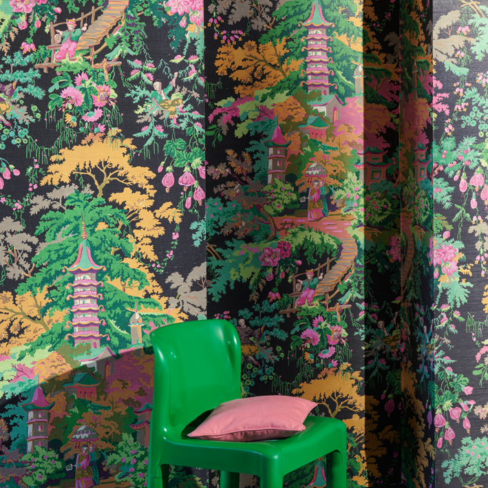 Pierre Frey 아카이브에서 발굴한 19세기 과슈에 담긴 일본 정원의 구성과 우아함을 재현했습니다. non-woven 배킹 위 라미네이트된 라피아 백그라운드에 프린트되었습니다.