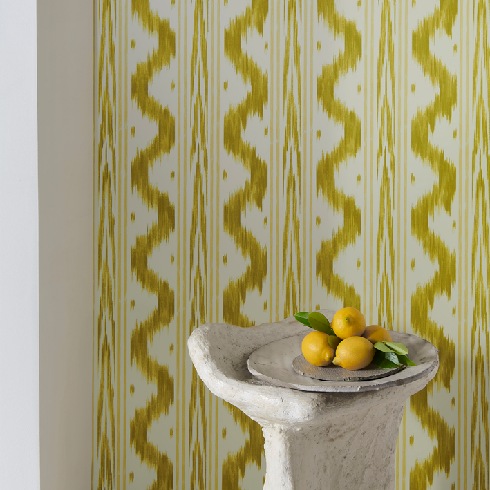 18세기 프랑스의 Toile de Nantes 또는 이카트 패턴이 느껴집니다. 시간의 흐름에 구애받지 않는 대표적인 패턴으로서, 넓은 폭의 non-woven 배킹에 스크린 프린트되었습니다. 월페이퍼 롤과 패브릭으로 만나볼 수 있습니다.