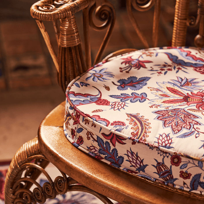 The ÉGLANTINE fabric is inspired by a Quenin archive, in the spirit of a floral indienne. Redrawn to retain the hand-printed effect of the archive, with all the irregularities of the design line, this Indian is woven and printed in France on a 100% cotton canvas.