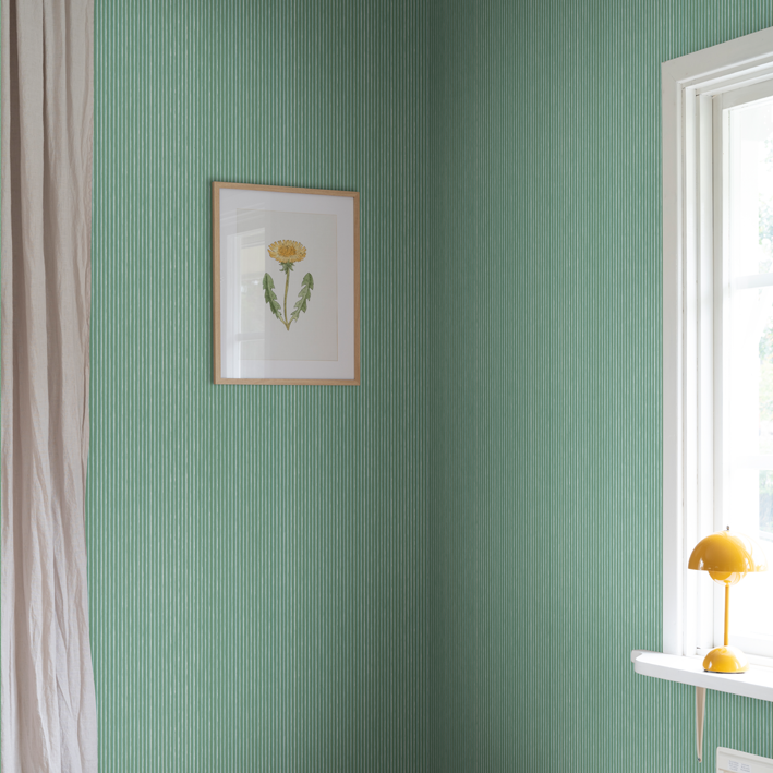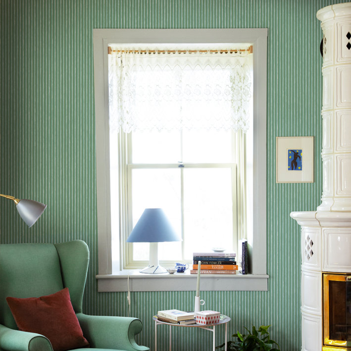 This design is part of the collection inspired by Carl and Karin Larsson, an iconic and beloved Swedish design family active in the 19th century. The design duo still inspires the whole world with their artistry, their home, and their way of living. The bright living room at Lilla Hyttnäs is in the late Gustavian style, with carpets in blue and white and woven covers for the couches. The pink walls were framed with green cornices that were popular in British homes during the late 1800s. It’s a lovely style clash, and it looks very natural. Our little stripe intertwines the woven fabric with the color scheme of the room.