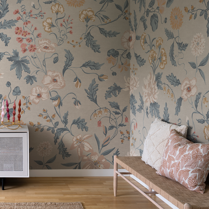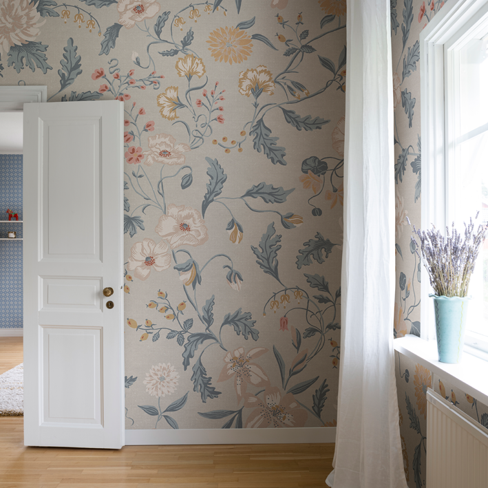This design is part of the collection inspired by Carl and Karin Larsson, an iconic and beloved Swedish design family active in the 19th century. The design duo still inspires the whole world with their artistry, their home, and their way of living. This hand-painted design adds beauty to your home. This delicate and decorative wall mural gives a sense of enlarging a space and an airy feeling of being outdoors during the lovely Swedish summer. A delightful lingering flower bonanza, an enlarged version of its wallpaper sibling Till Karin.
