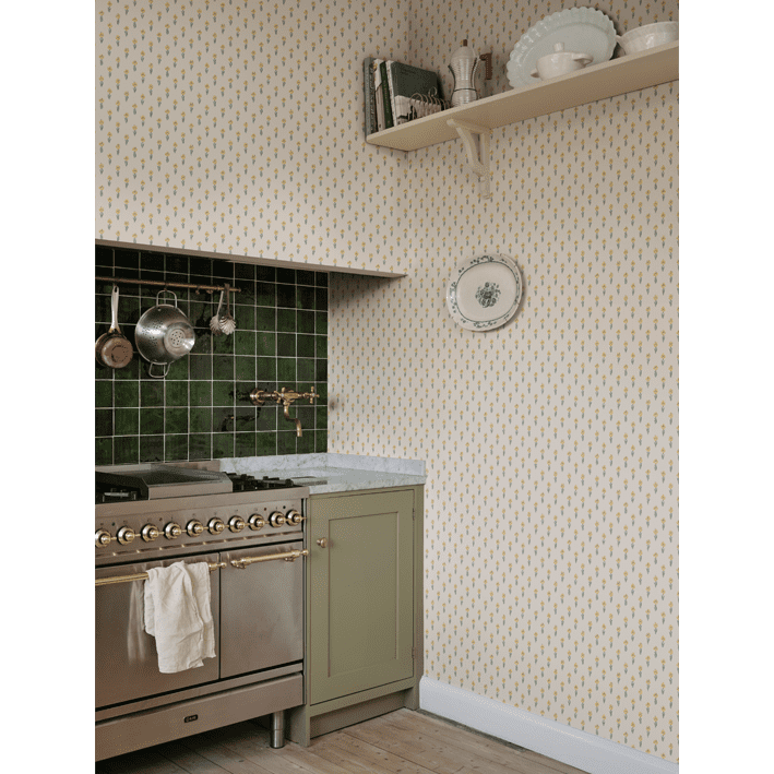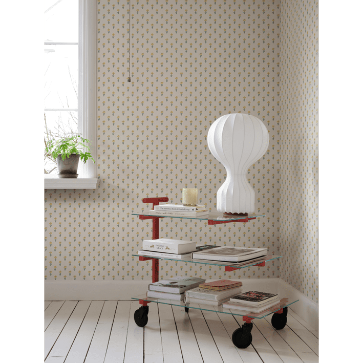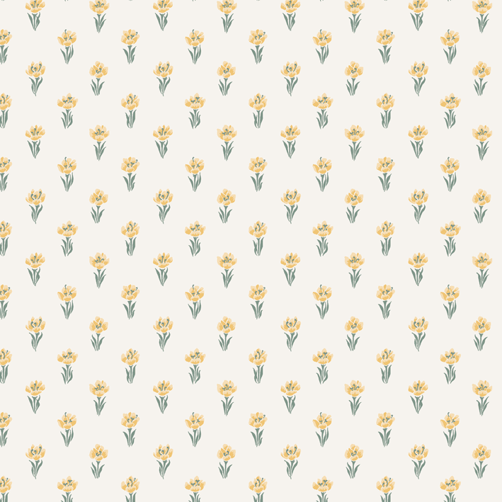 Eight tiny crocuses named "Timeless" are gathered in this decorative pattern, created in collaboration with Johanna Bradford. A detailed dotted pattern with a kind and cool international expression. The color scheme Yellow comes in pleasant shades of yellow and green on an off-white background.
