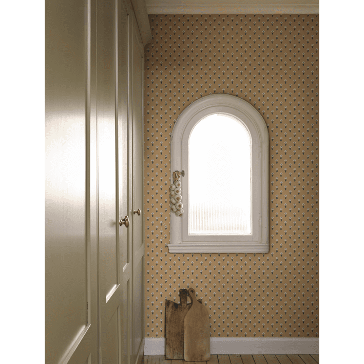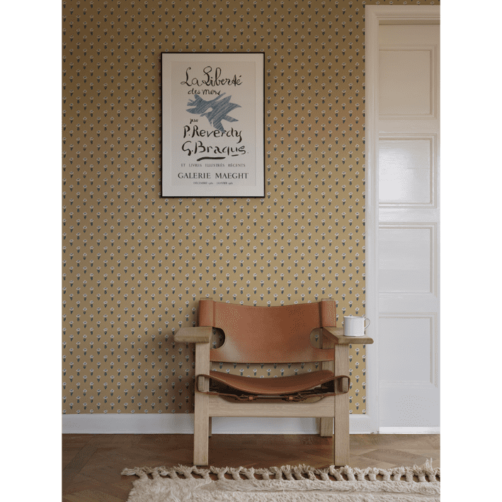Eight tiny crocuses named "Timeless" are gathered in this decorative pattern, created in collaboration with Johanna Bradford. A detailed dotted pattern with a kind and cool international expression. The color scheme Honey comes in pleasant shades of beige and dark blue on a soft but warm saffron background.