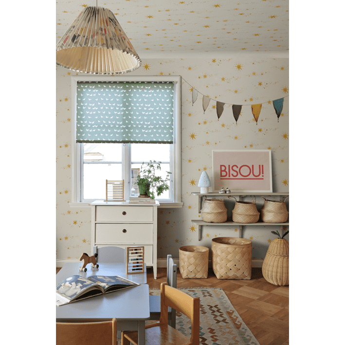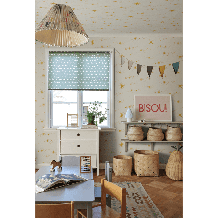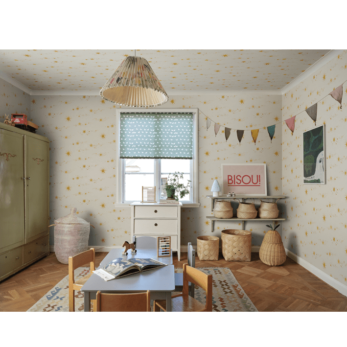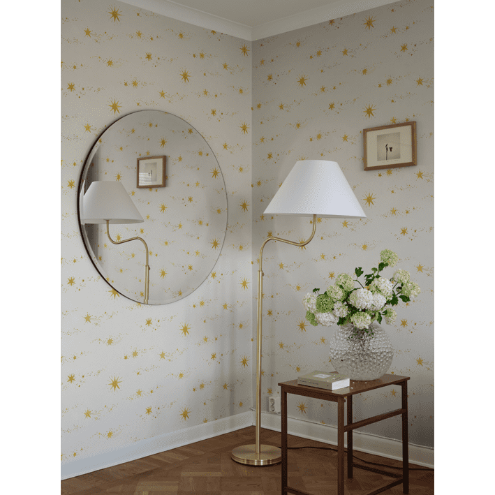 The beautiful hand-painted stars dance over the paper like stars in the sky. Created together with Johanna Bradford as a dreamy ceiling wallpaper, but it also works beautifully on the wall. The color scheme Yellow has bright yellow stars.
