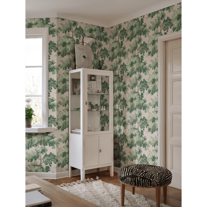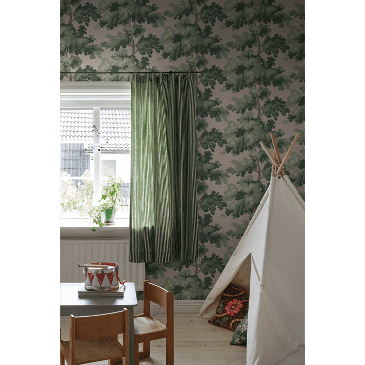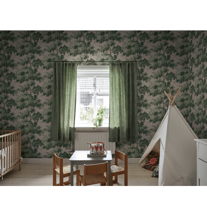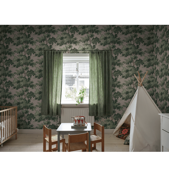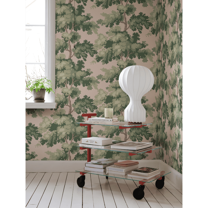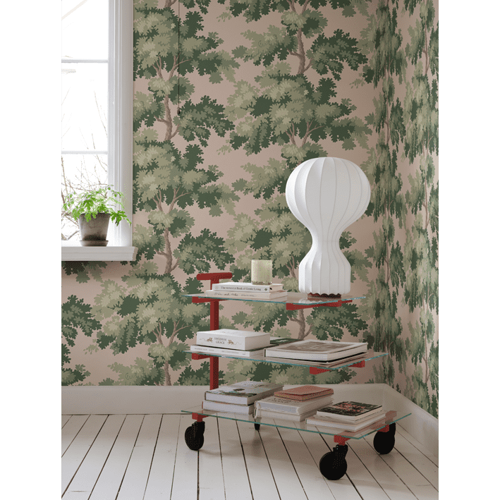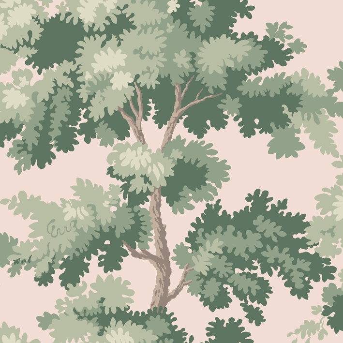 Raphael is one of our most popular wallpapers. The pattern gives you treetops in a wide range of color combinations. The inspiration for this pattern was partly taken from Central Park in New York - a leafy park surrounded by glass-and-concrete skyscrapers and a beautiful contrast to the bustling city. The pattern is also inspired by antique tapestries, where stylised leaves are often shown in fields of light and shade. Raphael, Pink, comes in shades of green on a lovely pink background.
