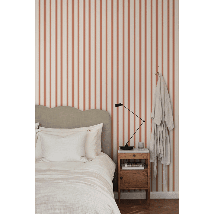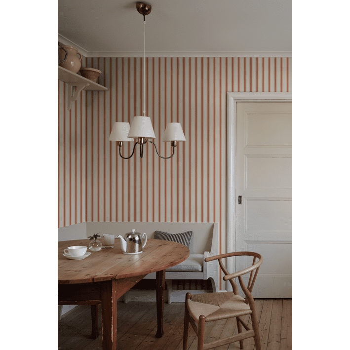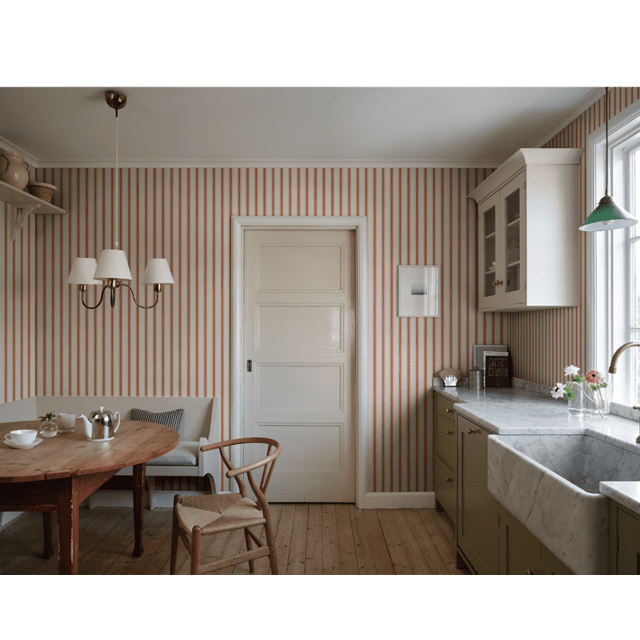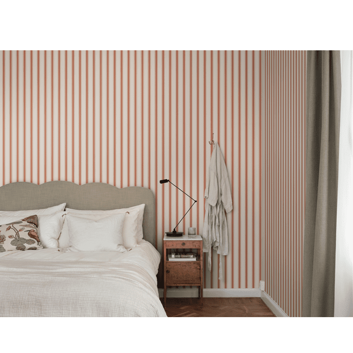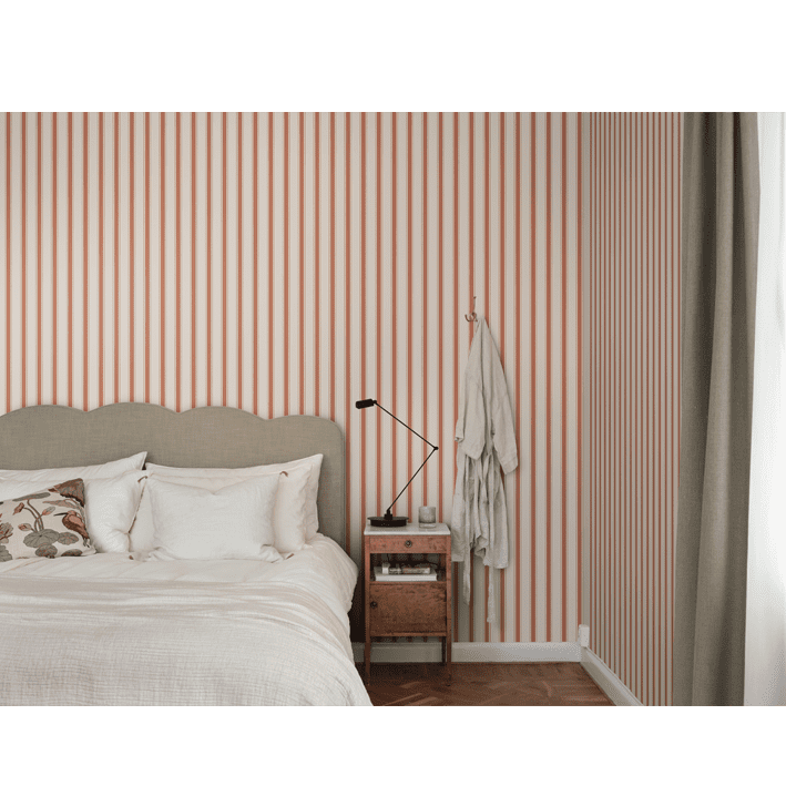 Our classic narrow stripe with small elegant gold dots is inspired by the beautiful silk draperies and furniture fabrics of the 18th century. Choose from classic colors that blend in with the room or one of the more colorful ones that give a distinct exclusive impression. Gustav, Red, is a colorway in a beautiful bright red.