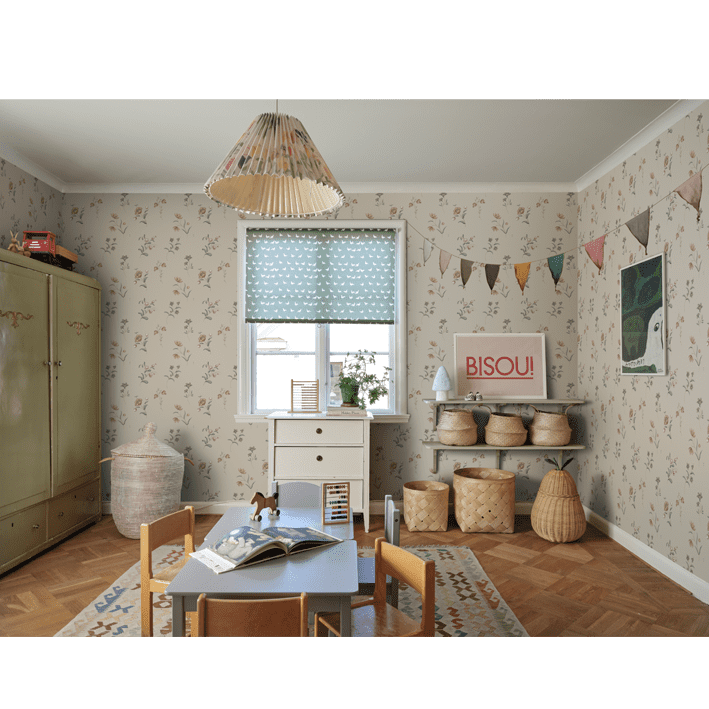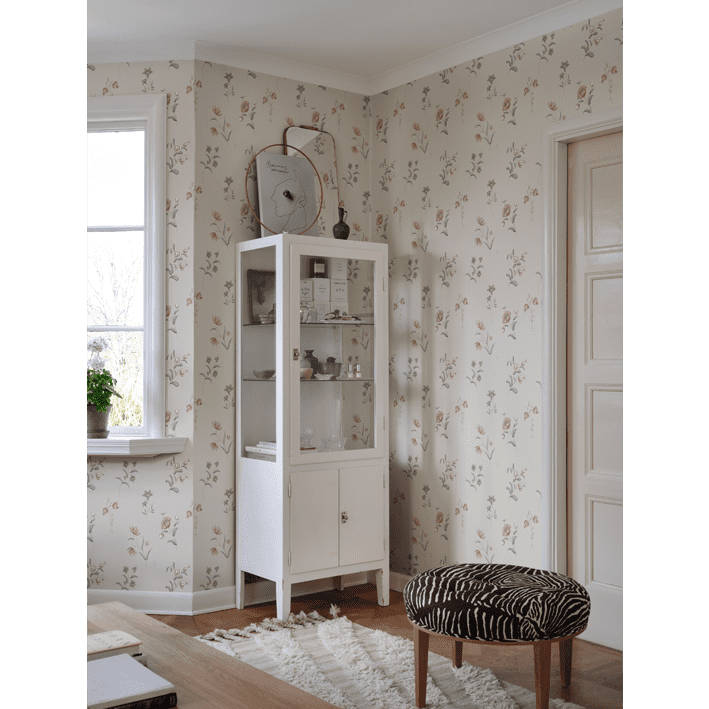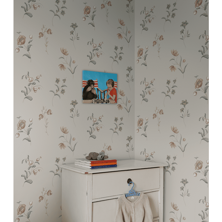 A patterned design slightly flirting with Swedish folk art and decorative painting from the 18th century. The bold brushstrokes and harmonious color scheme create an authentic feeling of hand-painted flowers on the wall. Hanna, Sandstone, comes in soft pastels on a beige sandstone background.