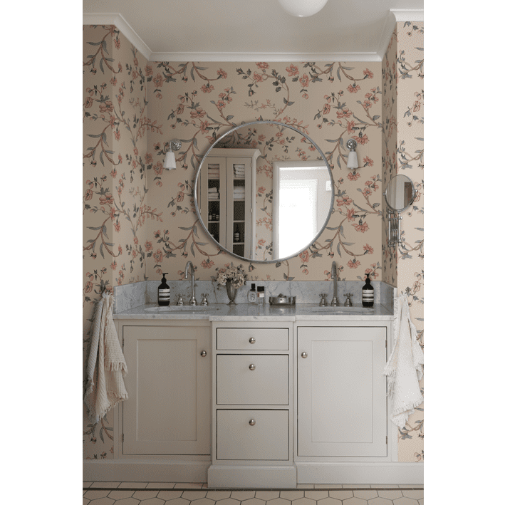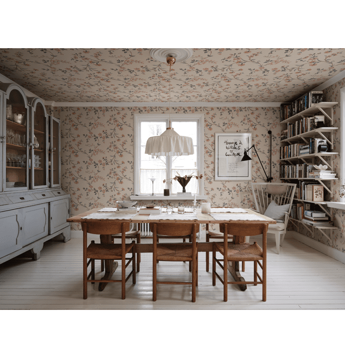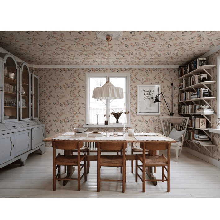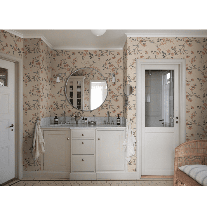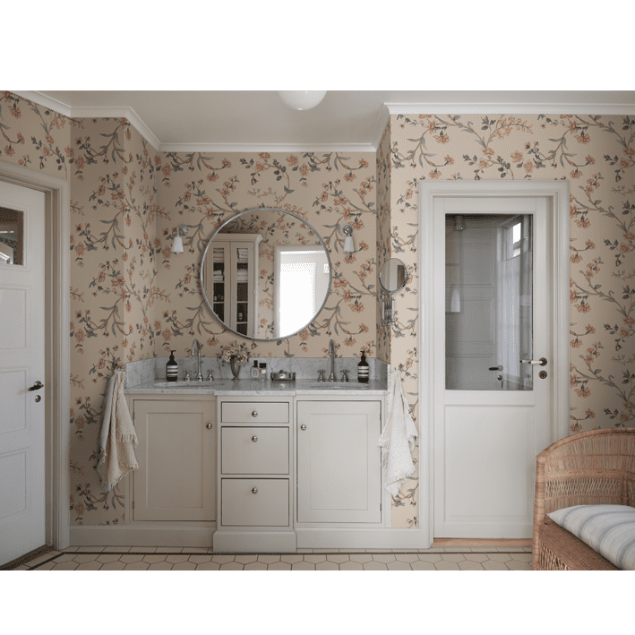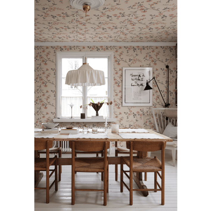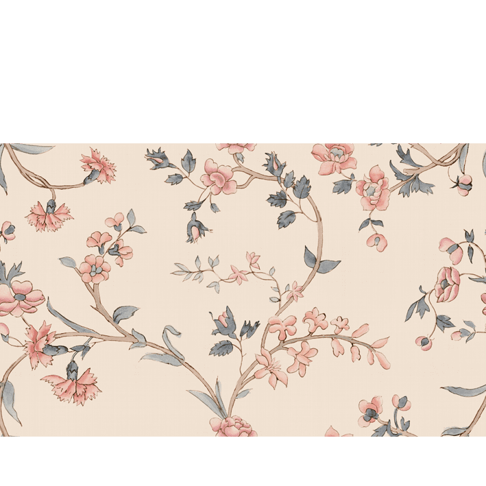 A romantic floral pattern from the 19th century with a pleasing hand-painted expression in harmonious colors. Soft in its appearance and with a vintage feel. Clara, Pastel, has flowers in pale pastel blues, pinks, and blue on a beige background.