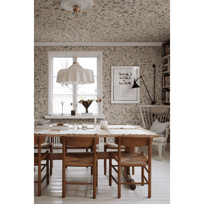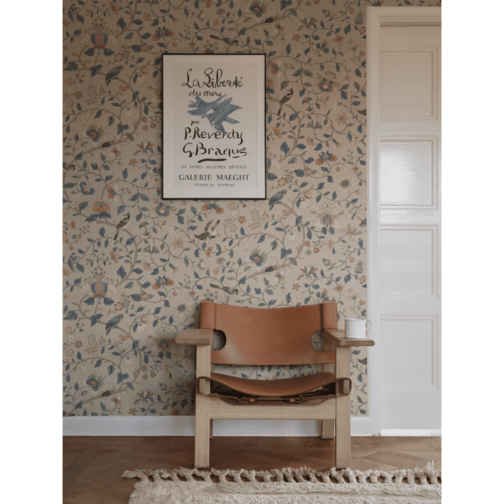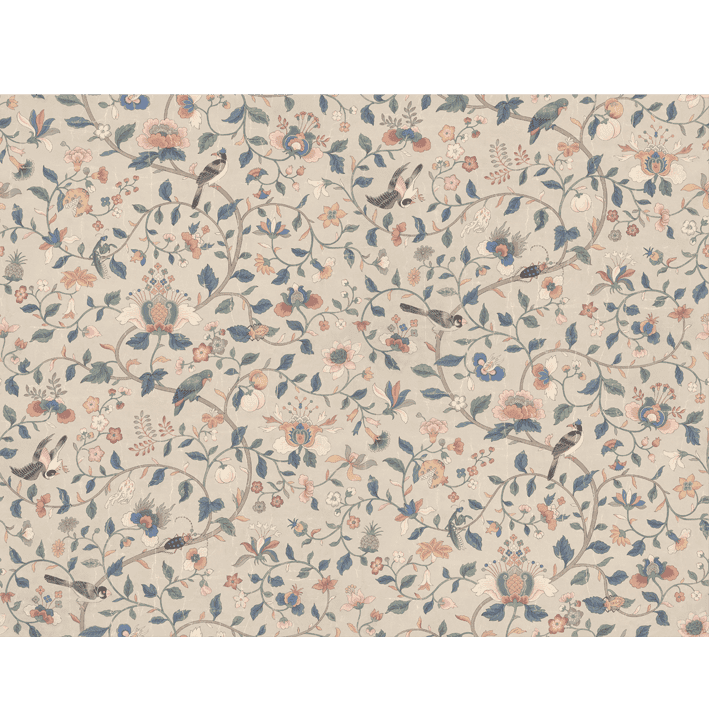 Exquisitely detailed older hand-painted original, which, with its multifaceted colors, can match many different interiors. Decorative and unique with history. The colorway, Hedda, Sandstone, has soft pastels in red, pink, green, and blue hues on a beige clay background.