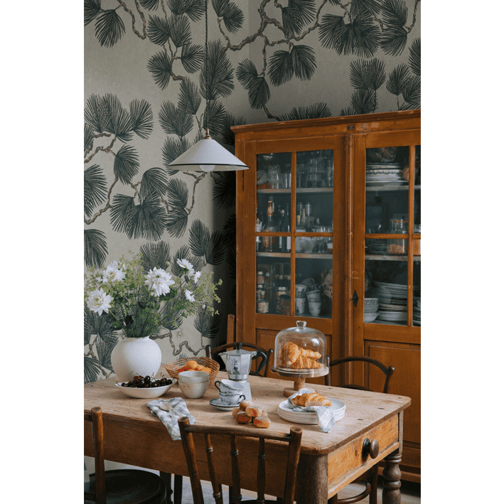 Windblown pines stand proudly in groups near the coastal meadows of Öland. Pine Mural is an enlarged version of our beloved pattern Pine, where the branches with feathery needles cover the wall in a light, airy dance. Lively yet serene. Pine Mural, Green, has a warm gray base with brown branches and lush green needles.