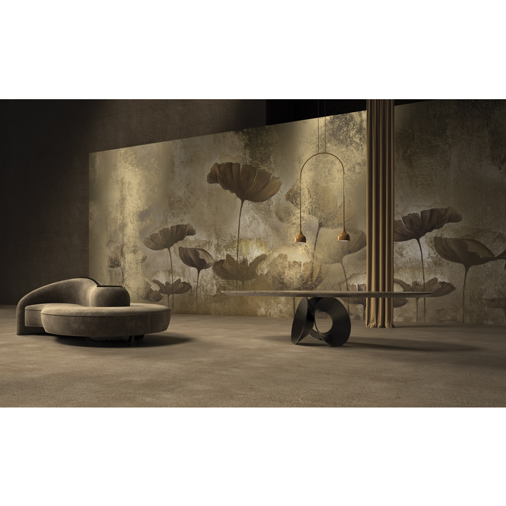 This collection features floral designs in earthy hues, infused with a subtle, surreal elegance reminiscent of shapes found in seashells or coral reefs. The intricate patterns, rendered on non-woven metallic material, offer a sophisticated and refined finish. Each design combines natural inspiration with a touch of class, creating a visually captivating and upscale aesthetic.