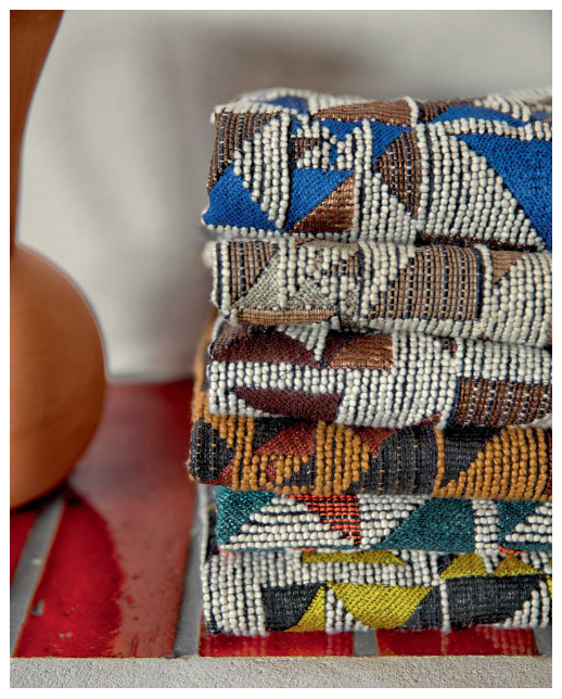 plant textiles, bamboo woven with metallic thread, shagreen patterning under glass beads...