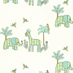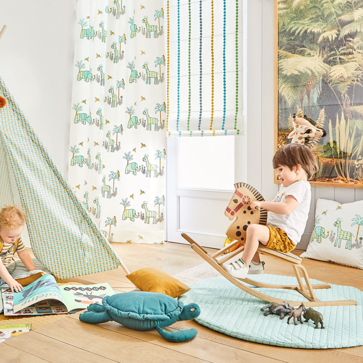 “Paul & Marius” the giraffe and the elephant are embroidered with a beautiful appliqué printed with small blue and green triangles, acidic and fresh. They live in a fairytale world filled with flowers, plants and tropical birds to tell magical stories about nature.