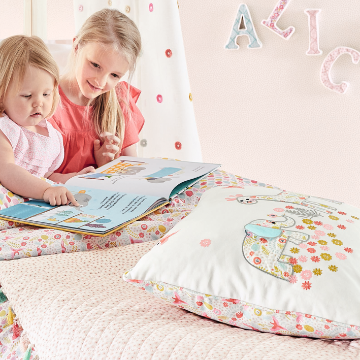 Alice & Candice”, an inseparable giraffe and elephant are having fun in their flower garden : a wonderful tropical paradise inhabited by mischievous parrots. They have dressed up in their colourful dresses : the same one because they are the best friends in the world ! Pink, coral, aniseed green and a touch of celadon blue : colours sparkling with “joie de vivre and sweetness.
