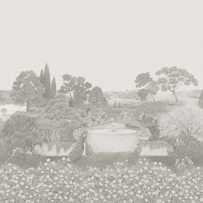 A glorious Idyll, the English landscape garden flourishes into an expansive, romantic scene of rolling hills, blooming rose bushes, proud peacocks, and mature trees as far as the eye can see.
