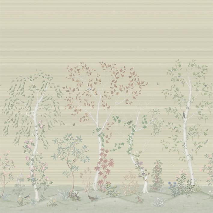 Maintaining the authenticity of Cole & Son’s perennial icon, Woods, Seasonal Woods Grasscloth features silver birch trees painted in a softer hand, surrounded by a symphony of woodland flora and fauna throughout the year. Like a balletic movement, each tree is full of life. Butterflies flutter by, woodpeckers, robins, and other creatures perch in branches with trailing ivy, holly, bramble berries, and apples displaying the bounty of the hedgerow as it changes over the seasons.