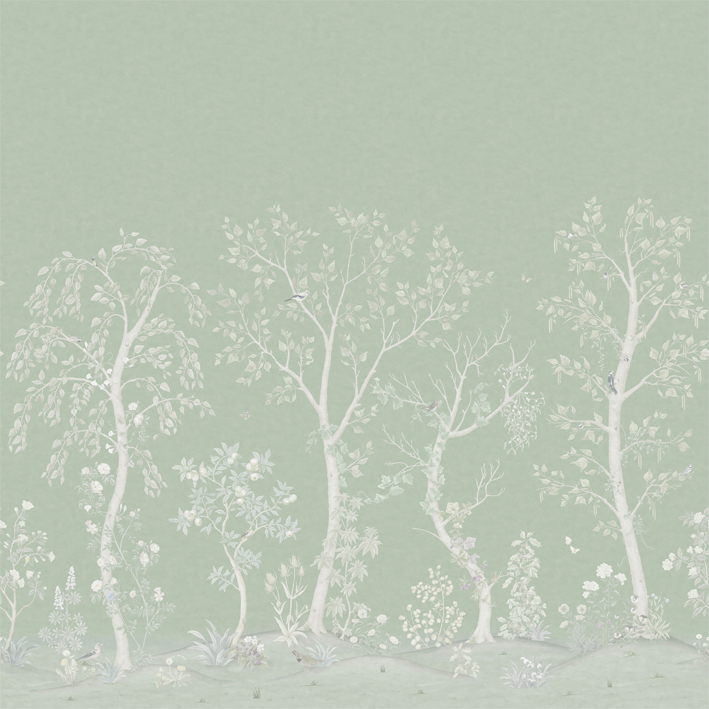 Maintaining the authenticity of Cole & Son’s perennial icon, Woods, Seasonal Woods features silver birch trees painted in a softer hand, surrounded by a symphony of woodland flora and fauna throughout the year. Like a balletic movement, each tree is full of life. Butterflies flutter by, woodpeckers, robins, and other creatures perch in branches with trailing ivy, holly, bramble berries, and apples displaying the bounty of the hedgerow as it changes over the seasons.