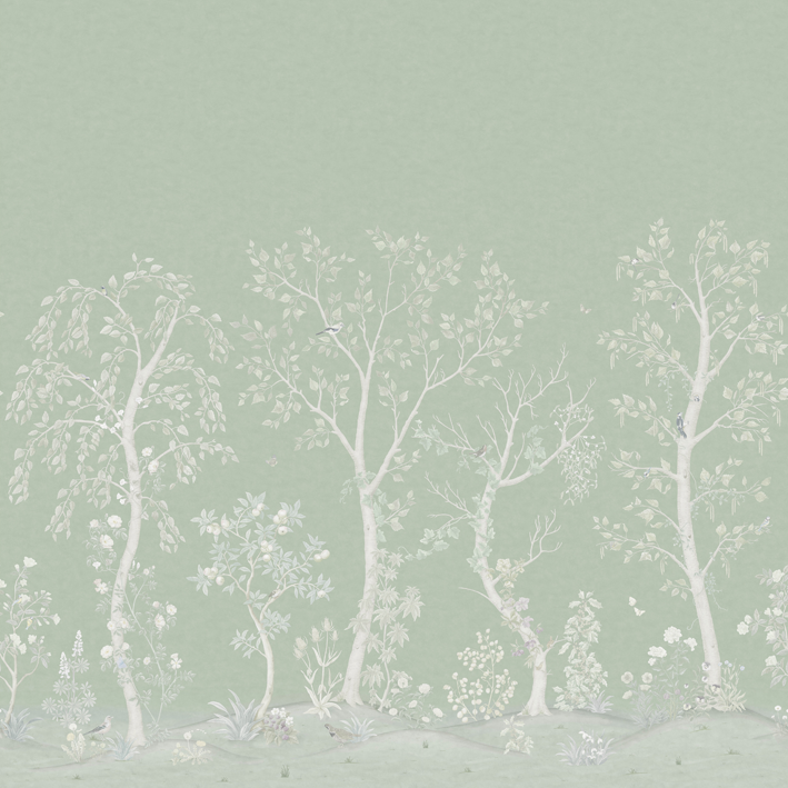 Maintaining the authenticity of Cole & Son’s perennial icon, Woods, Seasonal Woods features silver birch trees painted in a softer hand, surrounded by a symphony of woodland flora and fauna throughout the year. Like a balletic movement, each tree is full of life. Butterflies flutter by, woodpeckers, robins, and other creatures perch in branches with trailing ivy, holly, bramble berries, and apples displaying the bounty of the hedgerow as it changes over the seasons.