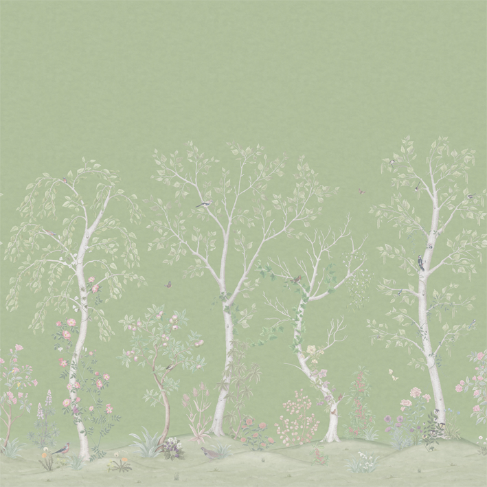 Maintaining the authenticity of Cole & Son’s perennial icon, Woods, Seasonal Woods features silver birch trees painted in a softer hand, surrounded by a symphony of woodland flora and fauna throughout the year. Like a balletic movement, each tree is full of life. Butterflies flutter by, woodpeckers, robins, and other creatures perch in branches with trailing ivy, holly, bramble berries, and apples displaying the bounty of the hedgerow as it changes over the seasons.