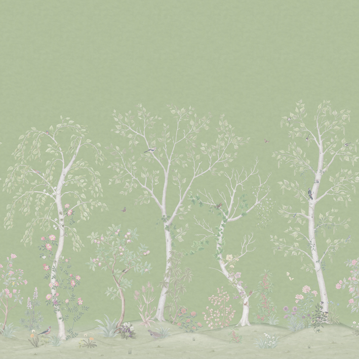 Maintaining the authenticity of Cole & Son’s perennial icon, Woods, Seasonal Woods Silk features silver birch trees painted in a softer hand, surrounded by a symphony of woodland flora and fauna throughout the year. Like a balletic movement, each tree is full of life. Butterflies flutter by, woodpeckers, robins, and other creatures perch in branches with trailing ivy, holly, bramble berries, and apples displaying the bounty of the hedgerow as it changes over the seasons.