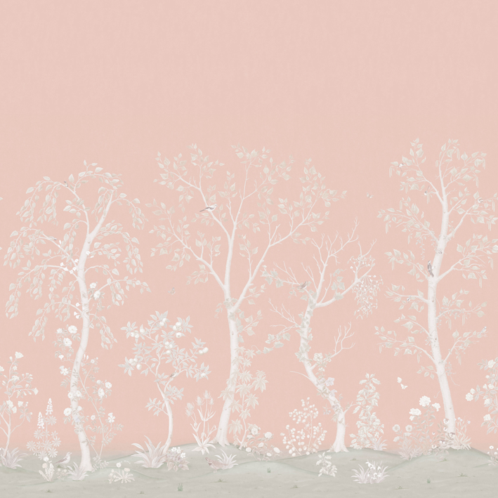 Maintaining the authenticity of Cole & Son’s perennial icon, Woods, Seasonal Woods Silk features silver birch trees painted in a softer hand, surrounded by a symphony of woodland flora and fauna throughout the year. Like a balletic movement, each tree is full of life. Butterflies flutter by, woodpeckers, robins, and other creatures perch in branches with trailing ivy, holly, bramble berries, and apples displaying the bounty of the hedgerow as it changes over the seasons.
