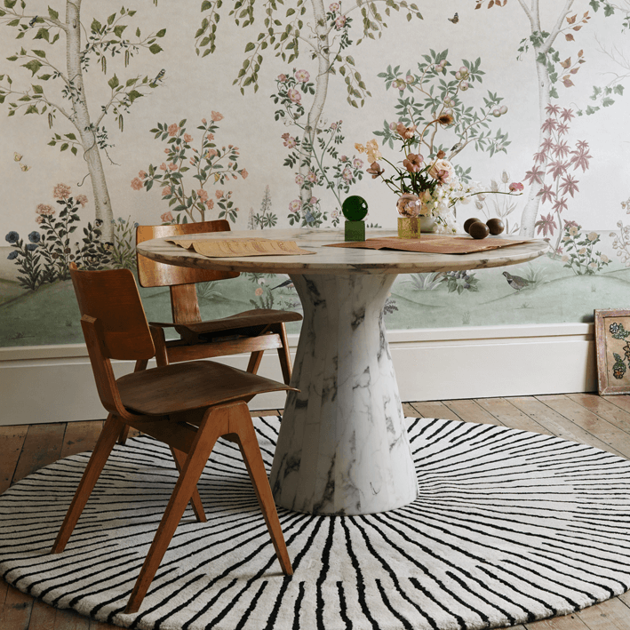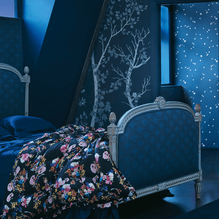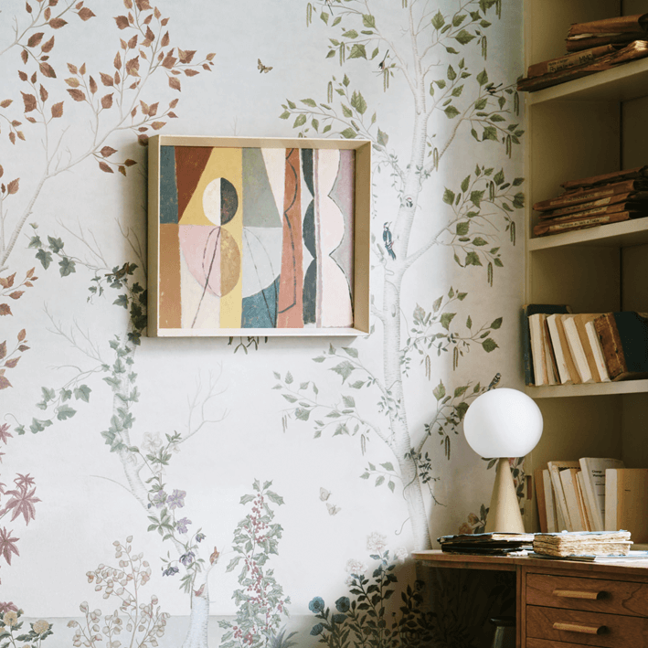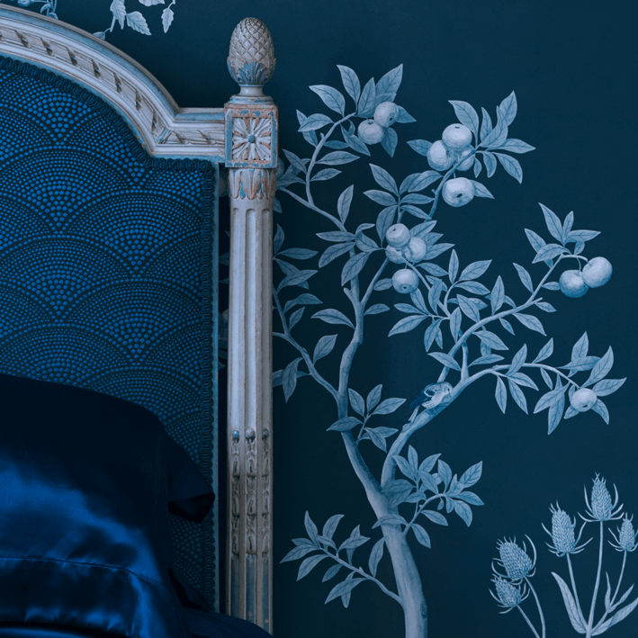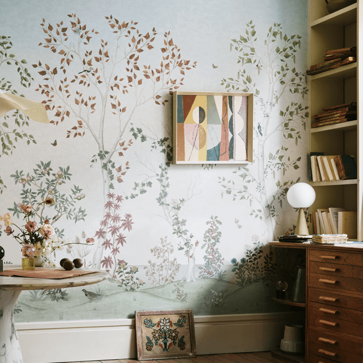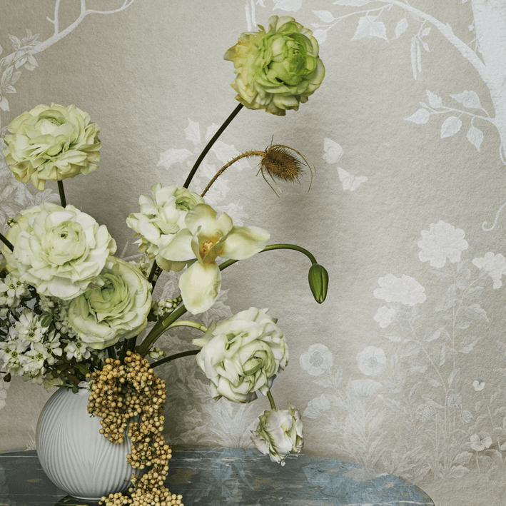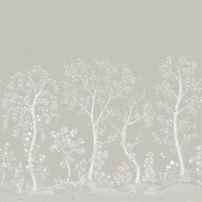 Maintaining the authenticity of Cole & Son’s perennial icon, Woods, Seasonal Woods Silk features silver birch trees painted in a softer hand, surrounded by a symphony of woodland flora and fauna throughout the year. Like a balletic movement, each tree is full of life. Butterflies flutter by, woodpeckers, robins, and other creatures perch in branches with trailing ivy, holly, bramble berries, and apples displaying the bounty of the hedgerow as it changes over the seasons.