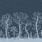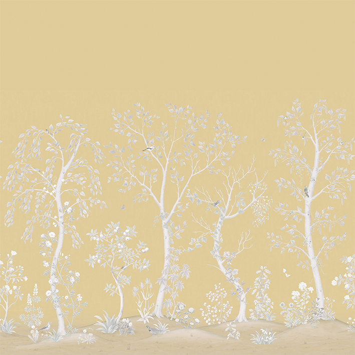 Maintaining the authenticity of Cole & Son’s perennial icon, Woods, Seasonal Woods features silver birch trees painted in a softer hand, surrounded by a symphony of woodland flora and fauna throughout the year. Like a balletic movement, each tree is full of life. Butterflies flutter by, woodpeckers, robins, and other creatures perch in branches with trailing ivy, holly, bramble berries, and apples displaying the bounty of the hedgerow as it changes over the seasons.