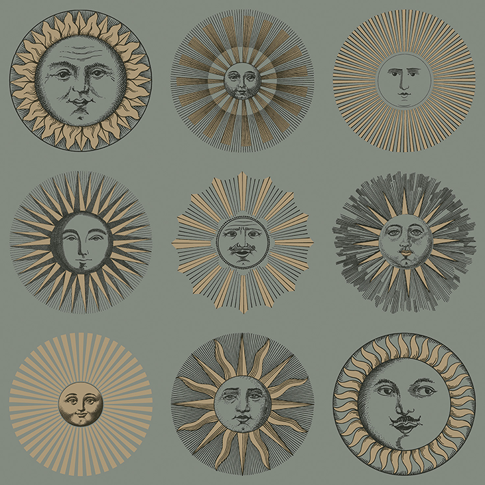 Presented as a striking repeat of shining faces, Soli’s colour palettes range from a strikingly simple monochrome to a rich emerald green with radiant golden suns.