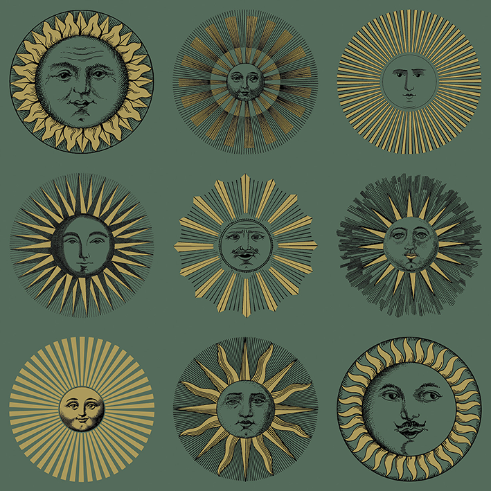 Presented as a striking repeat of shining faces, Soli’s colour palettes range from a strikingly simple monochrome to a rich emerald green with radiant golden suns.