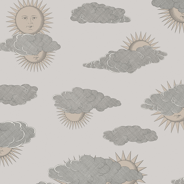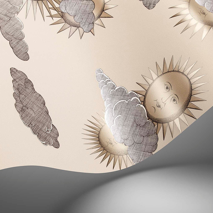 The inspiration of this print is ‘Sole di Capri’ a design created by Piero Fornasetti in the 50s. Piero Fornasetti long had a passion for Capri and created this iconic design from his imagination, before ever having visited the legendary island. Piero eventually took the family there on holiday and, during the 1960s, also opened a temporary Fornasetti boutique on the island. The original print is a combination of personified suns and stylized architecture, both typical of Fornasetti. The idea of pairing personified suns and clouds appears for the first time in a sketch for a headscarf that Piero drew in 1950. It is now a whimsical all-over print, bringing a unique quirk to an interior.