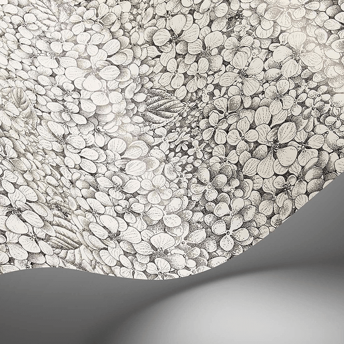 Stemming from the original ‘Ortensie’ design, Barnaba Fornasetti created a dense bouquet of petals with bees that at first covered a scarf and furniture of the Atelier. This bounteous floral print is full of life, drawing you into the garden and filling your thoughts with the sweet smells and sounds of summer. Soft pastels are reminiscent of organic Ortensia hues, whilst a simple monochrome accentuates the delicately detailed linework of this expansive design.