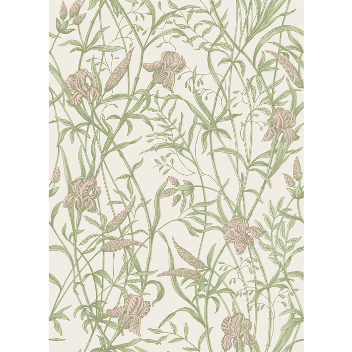 The leafy, detailed linework of Iris is typical of its once screen-printed production, with each layer being perfectly imperfect in its overlapping. The flower’s unique shape and immersive leaf repeat creates a full and lush wallcovering.